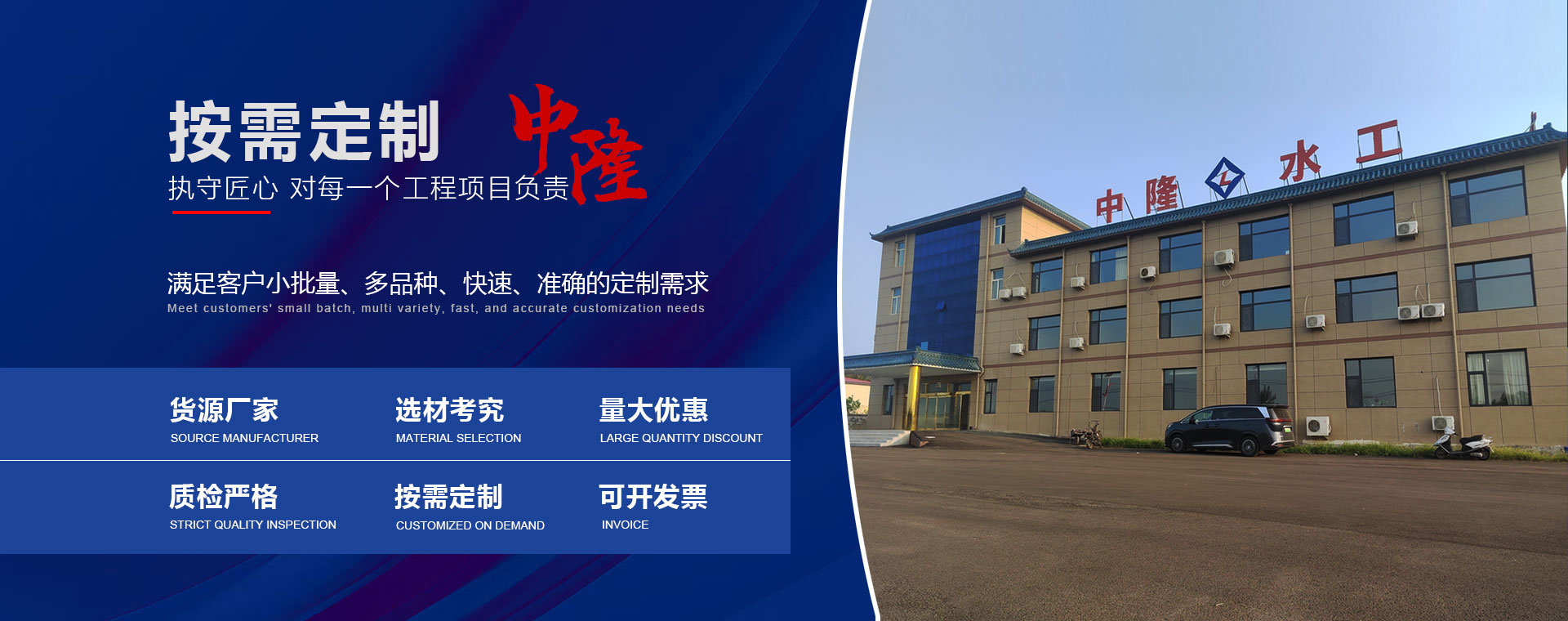 邢臺市中隆水工設備有限公司位于新河縣九龍工業園區占地面積20000平方米。北鄰北環路、西鄰西環路,交通便利。 公司堅持,依法經營,誠信服務的宗旨,尋求合作共創輝煌。融科研制造銷售安裝,服務為一體的水工設備專業制造公司。優質制造設備,規格齊全,產品檢測體系完整,各項技術指標均達到行業標準,給客戶提供無憂合作! 主要產品有: &n···